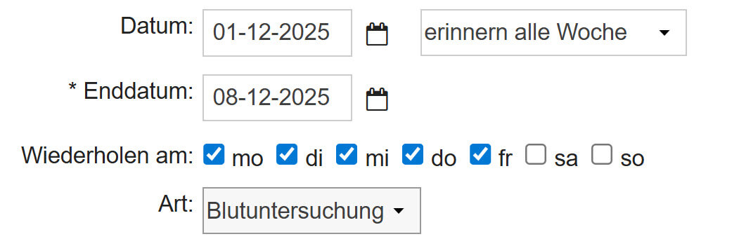 Beispiel: Wenn ein Patient eine Woche lang täglich einen Termin für eine Blutzuckerkontrolle hat, wählen Sie als Enddatum ein Datum eine Woche nach dem Startdatum und aktivieren Sie Montag bis Freitag.