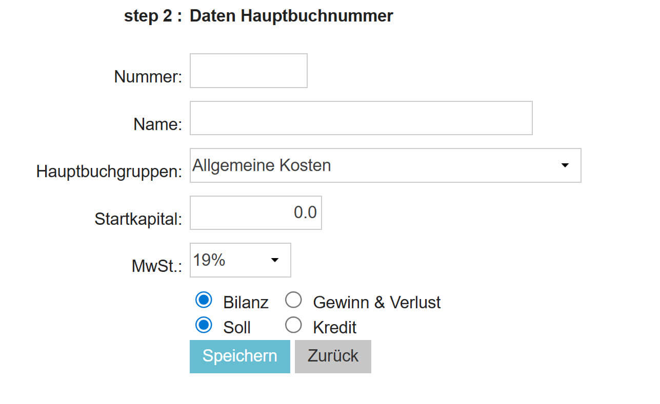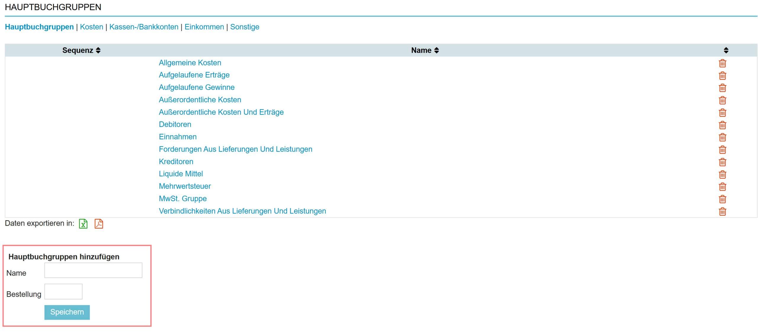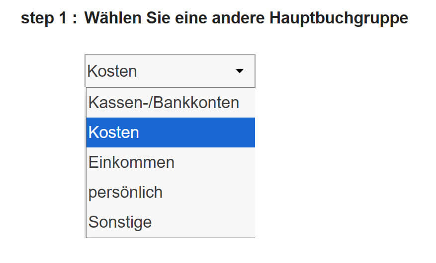 - Anschließend muss zunächst eine Hauptbuchgruppe ausgewählt werden. Im Dropdown-Menü stehen folgende Optionen zur Verfügung: Kassen-/Bankkonten, Kosten, Einkommen, Persönlich oder Sonstige.