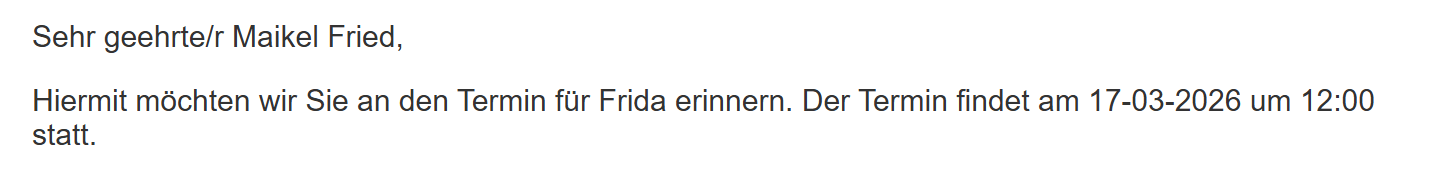 ErinnerungText${Erinnerung.Text}Patientenakte > Erinnerung > Feld "Erinnerungstext"jährliche Gesundheitskontrolle und Impfung