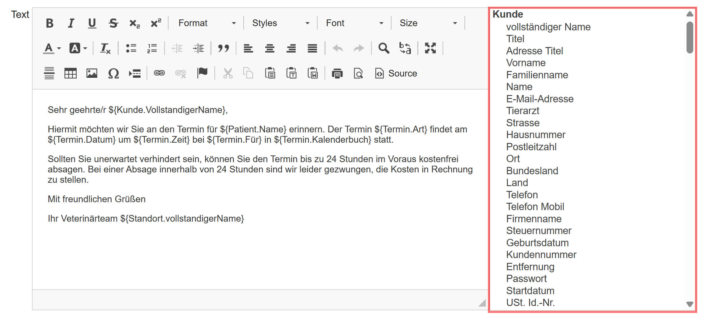 Wenn der Standardtext gespeichert ist und Sie ihn anschließend zu einem Kunden/Patienten hinzufügen, werden die Merge-Codes automatisch durch die Informationen dieses Kunden/Patienten ersetzt: