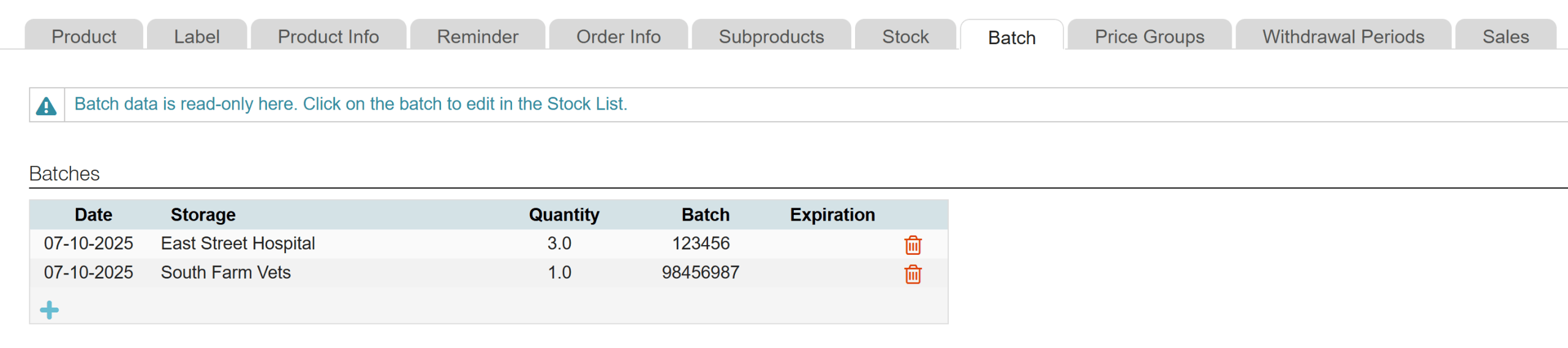 In this tab you will find the date the batch information was added, the storage location, quantity, batch number, as well as expiration dates of a product batch. The batch information is added automatically when you save an order that holds batch information for a product or when you add batch information via the batch editing modal. Should you want to add or edit batch information, click on a field to be taken to the Stock List page where you can add/edit and save the new batch information.