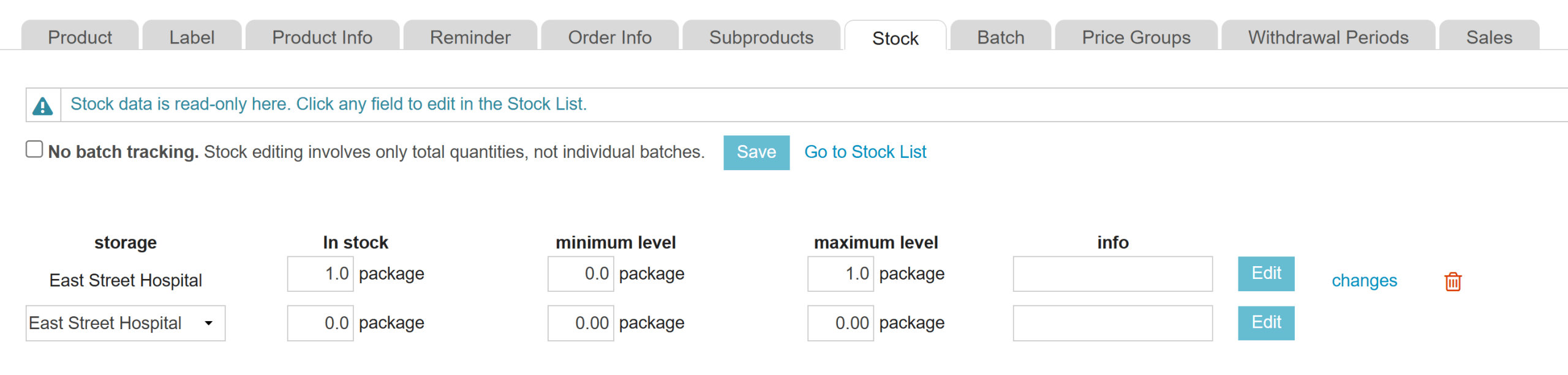 For items like needles or other disposables that you do not need to track batches or expiration dates for, you can select the checkbox “No batch tracking” at the top of the tab and click Save. This will allow you to update the total stock quantity directly without needing to enter batch information, it will disable the fields for batch number and expiry date when booking in orders for that product and when dispensing the product you do not see the batch drop-down menu.