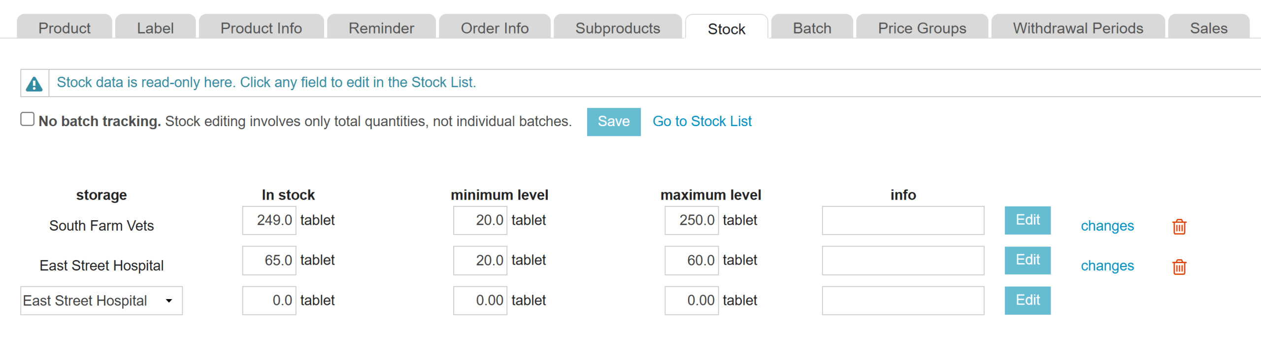 Stock can be tracked per storage location. Should you want to add or edit any of this information, click in the field to be taken to the Stock List page where you can add/edit and save the information. Or click the teal Go to Stock List at the top.
