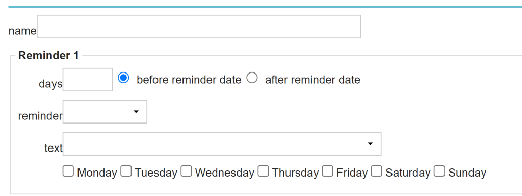 For example, if the product reminder due date is on January 30th (when the vaccination is due for renewal), you might want to send the notification 30 days before this date. So you would enter “30” in this field and check the box “before reminder date”. To send the notification after the reminder date, you tick the box “after reminder date”.