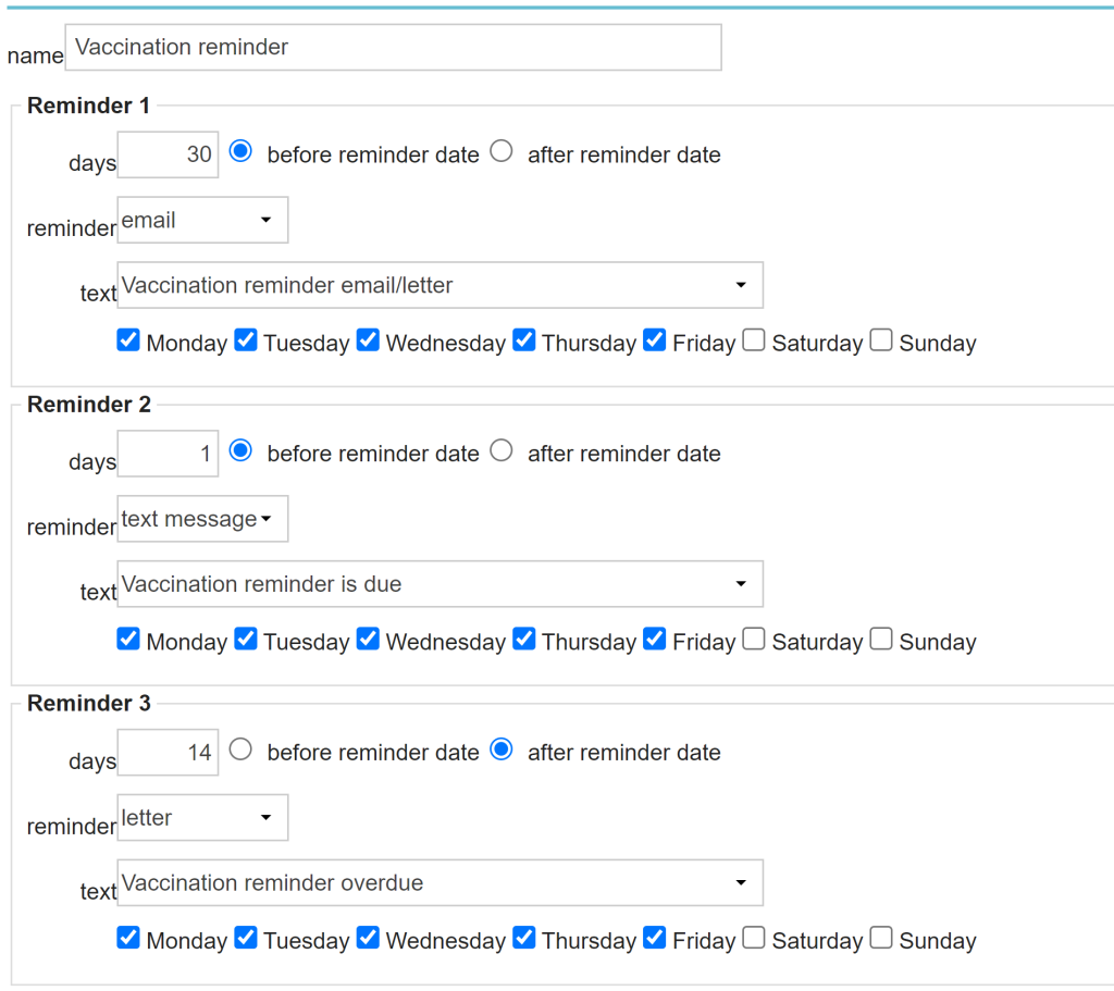 • Reminder 1: send an e-mail 30 days before the reminder due date using the letter template ‘Vaccination reminder email/letter’. These product reminders should only be sent out on weekdays.