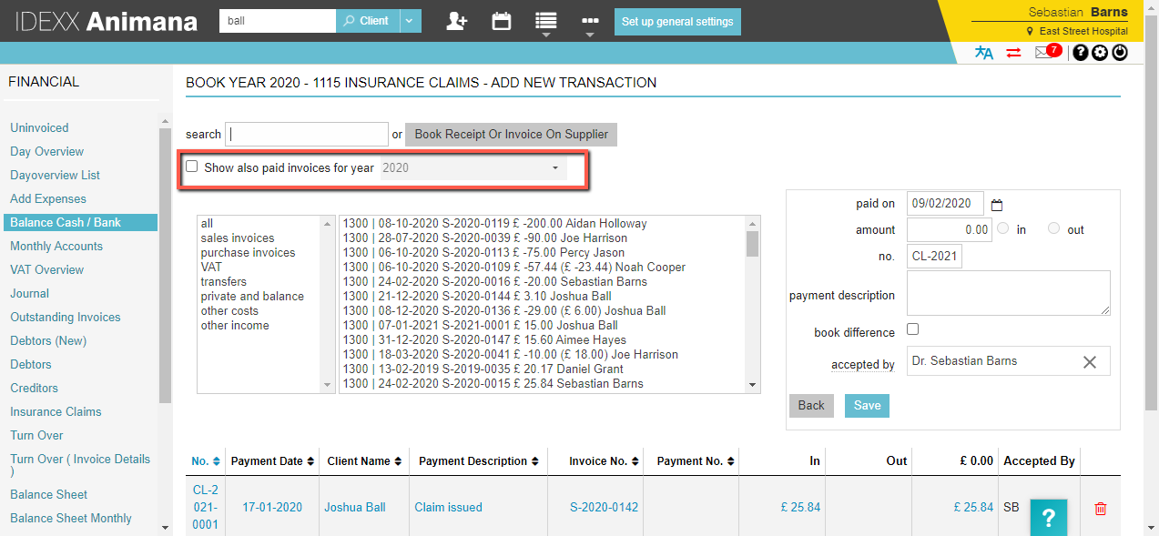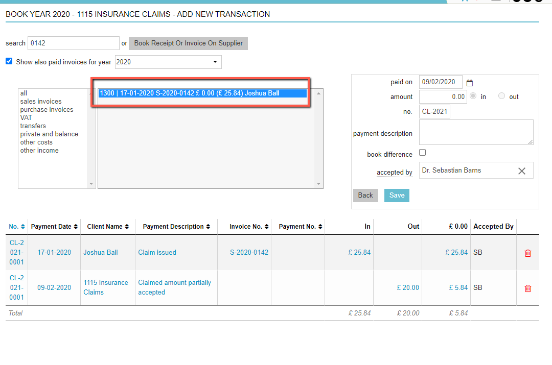 When you have received a partial payment from the insurance company after sending a claim, you first process that partial payment in the system. If you have not done that yet, read How do I allocate insurance payments? first. Once you’ve processed the partial insurance payment you will need to update the client record because the claimed invoice has a full payment booked on it, whereas it has only been partially refunded. The outstanding amount needs to be paid by the client, so this article will explain how to update the already processed invoice to reflect that outstanding amount.