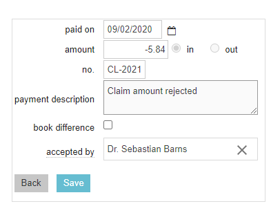 10. In the field “amount” you enter the amount that the insurance company did not pay, with a minus (-) in front of it. In this example: -5.84.