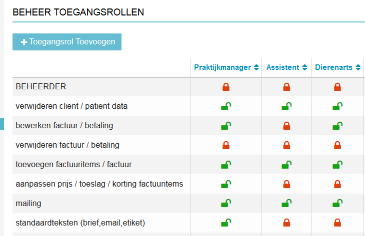 Iedere rij geeft de toegang weer tot een deel van het Animana systeem. Een groen en open hangslot houdt in dat gebruikers met deze toegangsrol toegang hebben en wijzigingen kunnen aanbrengen in dit deel van het systeem. Een rood en gesloten hanglot betekent dat de toegangsrol gesloten is en er geen toegang tot dit gebied is. Om de toegang toe te staan of te weigeren, klik je op het hangslot en wordt de toegang aangepast.