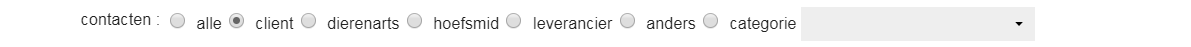 - Bij “contacten” kun je het type cliënt selecteren (alle, cliënt, dierenarts, hoefsmid, leverancier, anders, of categorie). Als je categorie selecteert, kun je uit het dropdownmenu een cliëntcategorie selecteren. Deze informatie komt uit de Cliëntdata.