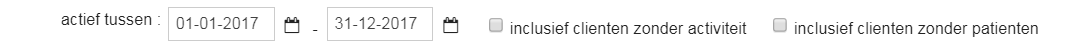 - Door gebruik te maken van de velden “Actief tussen” kun je op cliënten filteren, die binnen een bepaalde periode interactie met de dierenkliniek hebben gehad. Interactie wil zeggen dat er iets is toegevoegd in hun dossier. Je kunt de datum direct in de datumvelden invoeren of klik op het pictogram om de datumkiezer te gebruiken.